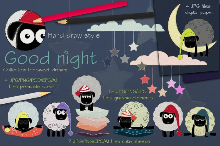 Collection Good night for sweet dreams for creating patterns for textile and baby clothes, nursery decor, decorating smartphones and notepad covers, sketchbooks and other stationary, birthday, greeting and business cards, t-shirts and bags, packaging design, wrapping paper and other.