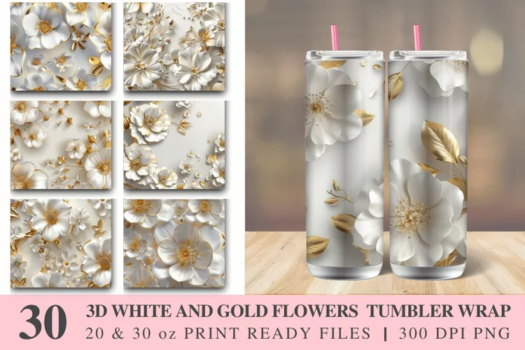 3D White And Gold Flowers Tumbler Wrap Bundle