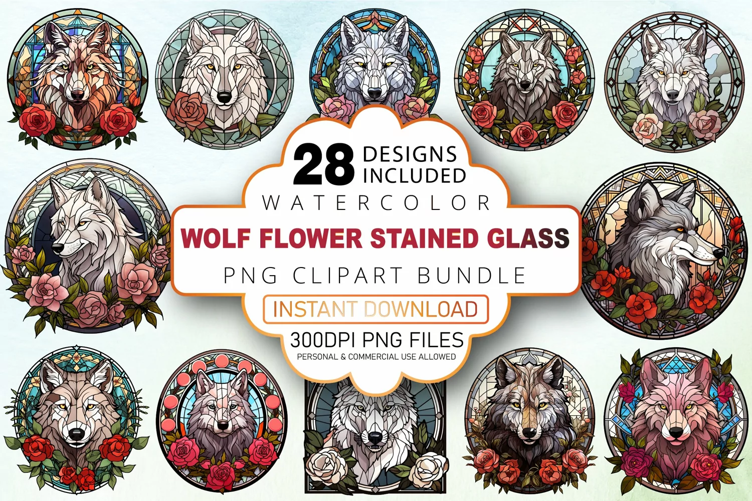 Watercolor Wolf Flower Stained Glass Clipart Bundle