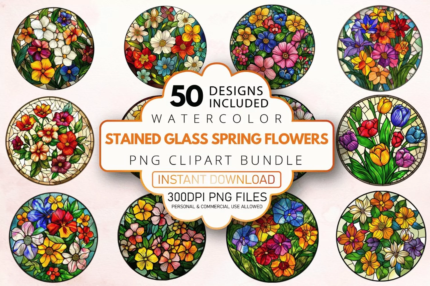 Similar Design Products to Watercolor Stained Glass Spring Flowers Clipart Bundle