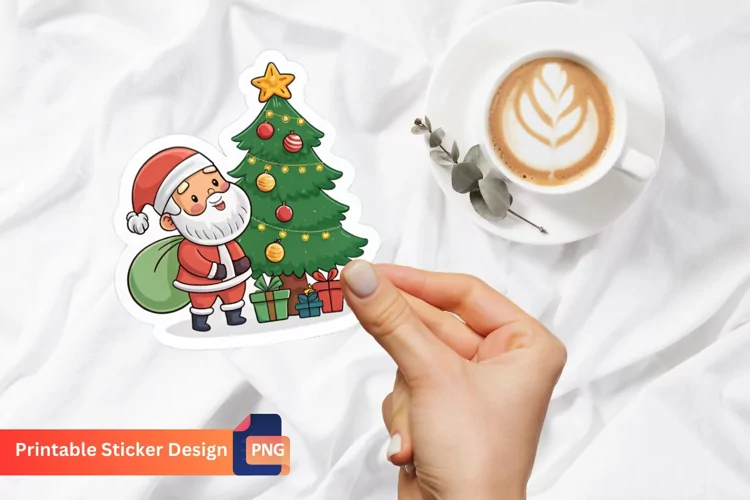 Christmas Santa And Tree Sticker, Winter Holiday Sticker