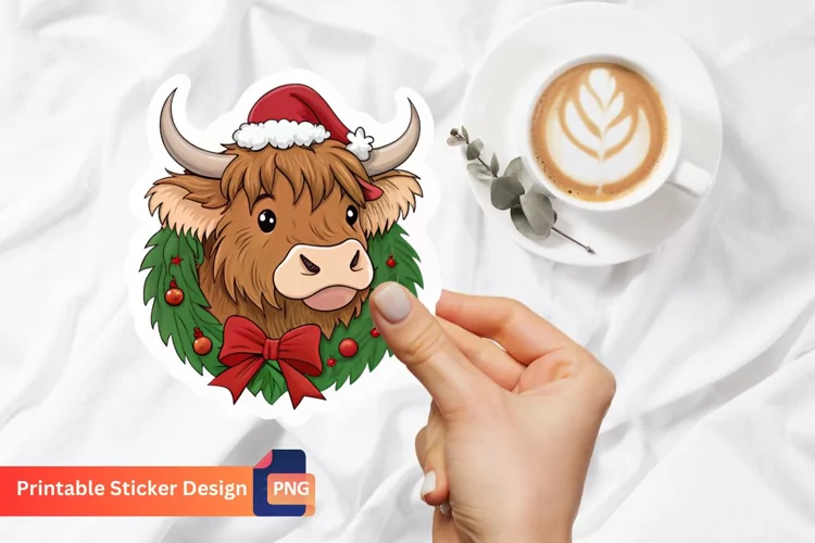 Christmas Highland Cow Sticker, Highland Cow Illustration