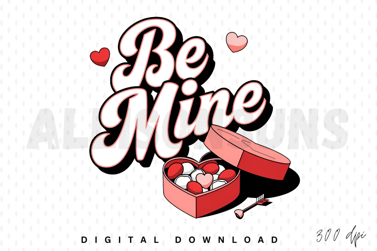 be mine, valentine, valentines day, retro, retro style, typography, love, heart, hearts, arrow, box, heart box, chocolates, candy, pink, red, digital art, illustration, holiday, graphic, design, vintage, text, greeting, 300 dpi, digital download, sublimat