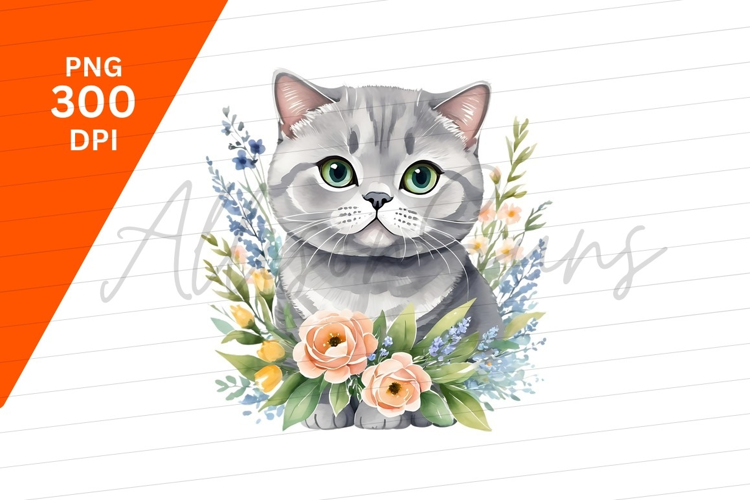 Cute Grey Cat With Floral Watercolor Wreath example image 1