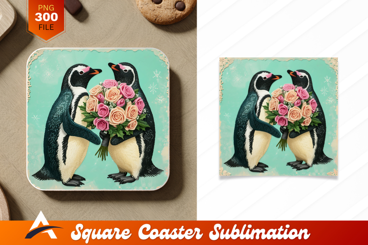 Two Penguins With Rose Bouquet Coaster Designs example image 1