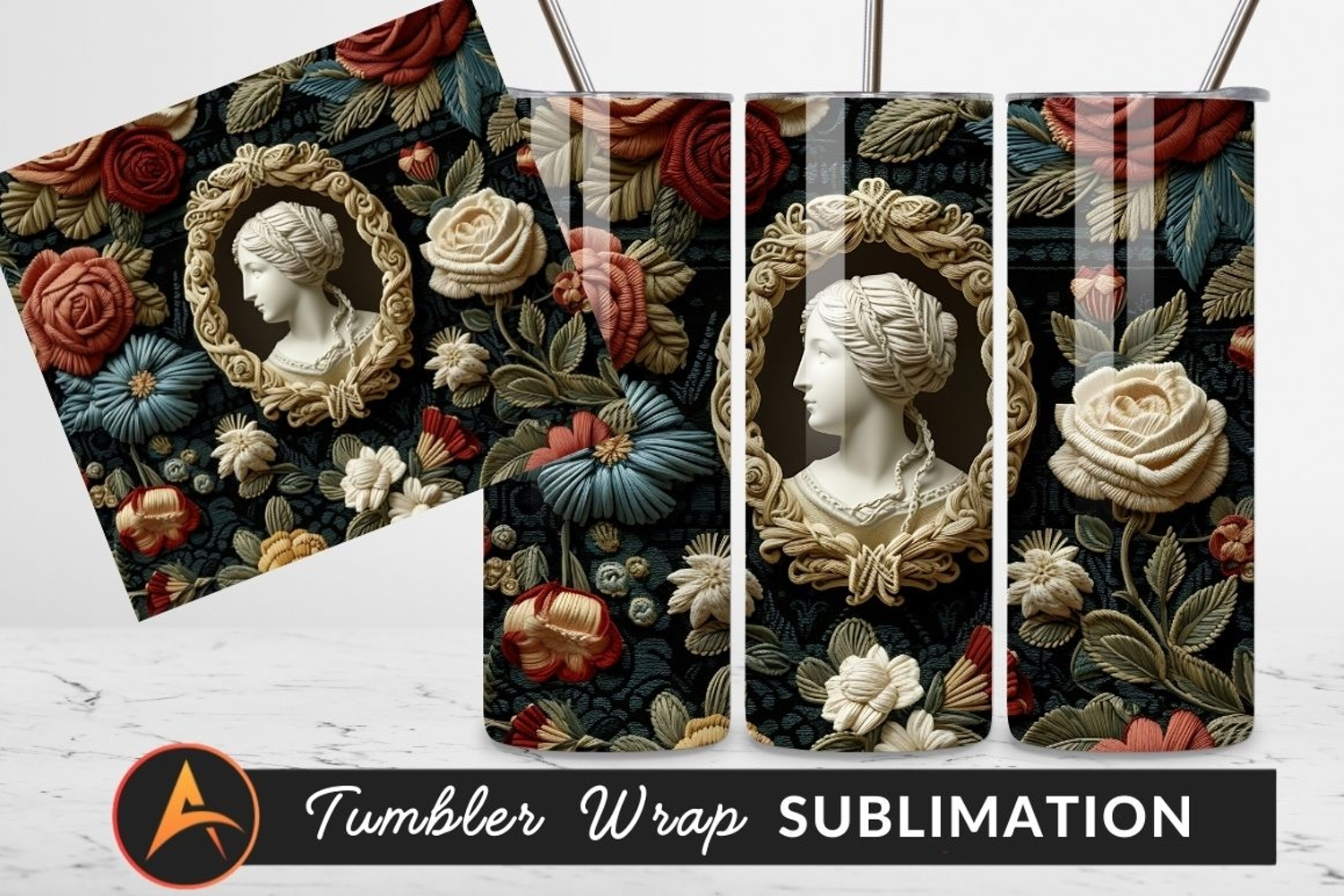 Art Floral Flowers Pattern Roses Textile Embroidery Embroidered Bust Tumbler Png