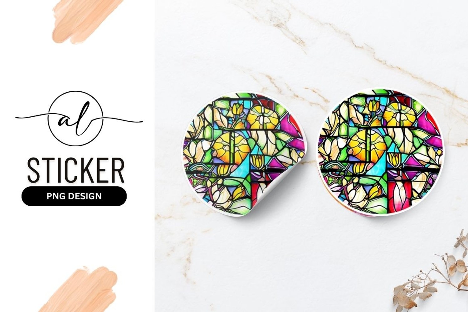 Colorful Floral Stained Glass Round Sticker Png example image 1