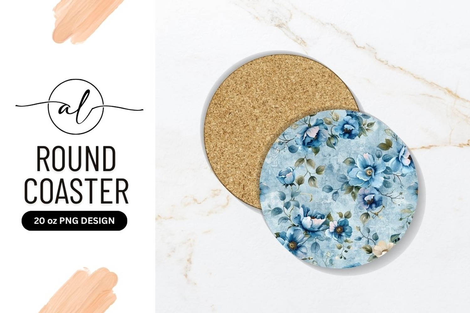 Watercolor Blue Floral Round Coaster Design with Leaves and Textured Background
