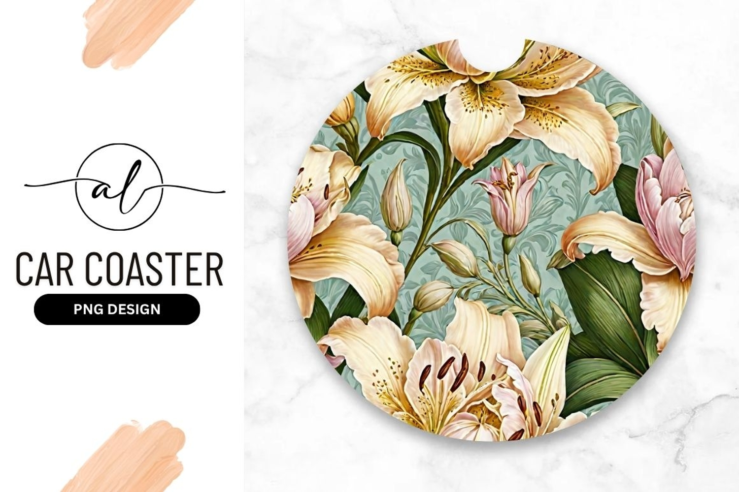 Floral Lily Pattern Round Car Coaster Png example image 1