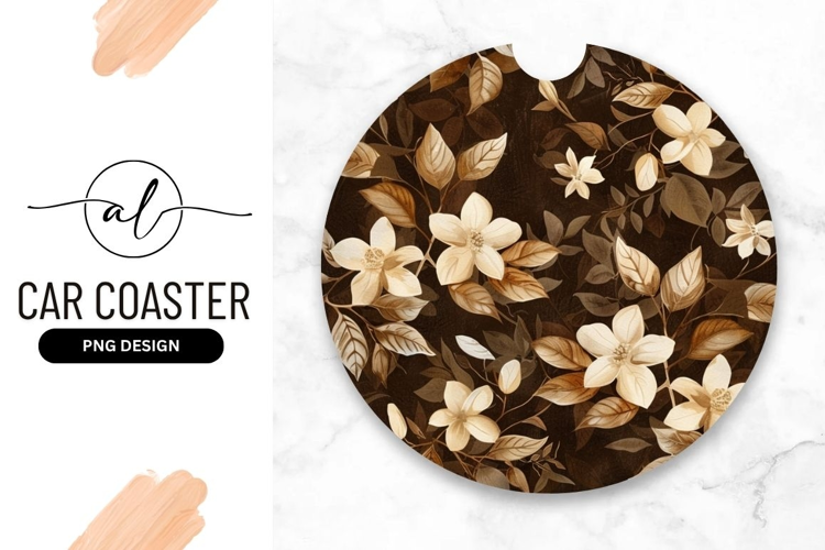 Floral Pattern Round Car Coaster Png with Beige Flowers and Brown Leaves