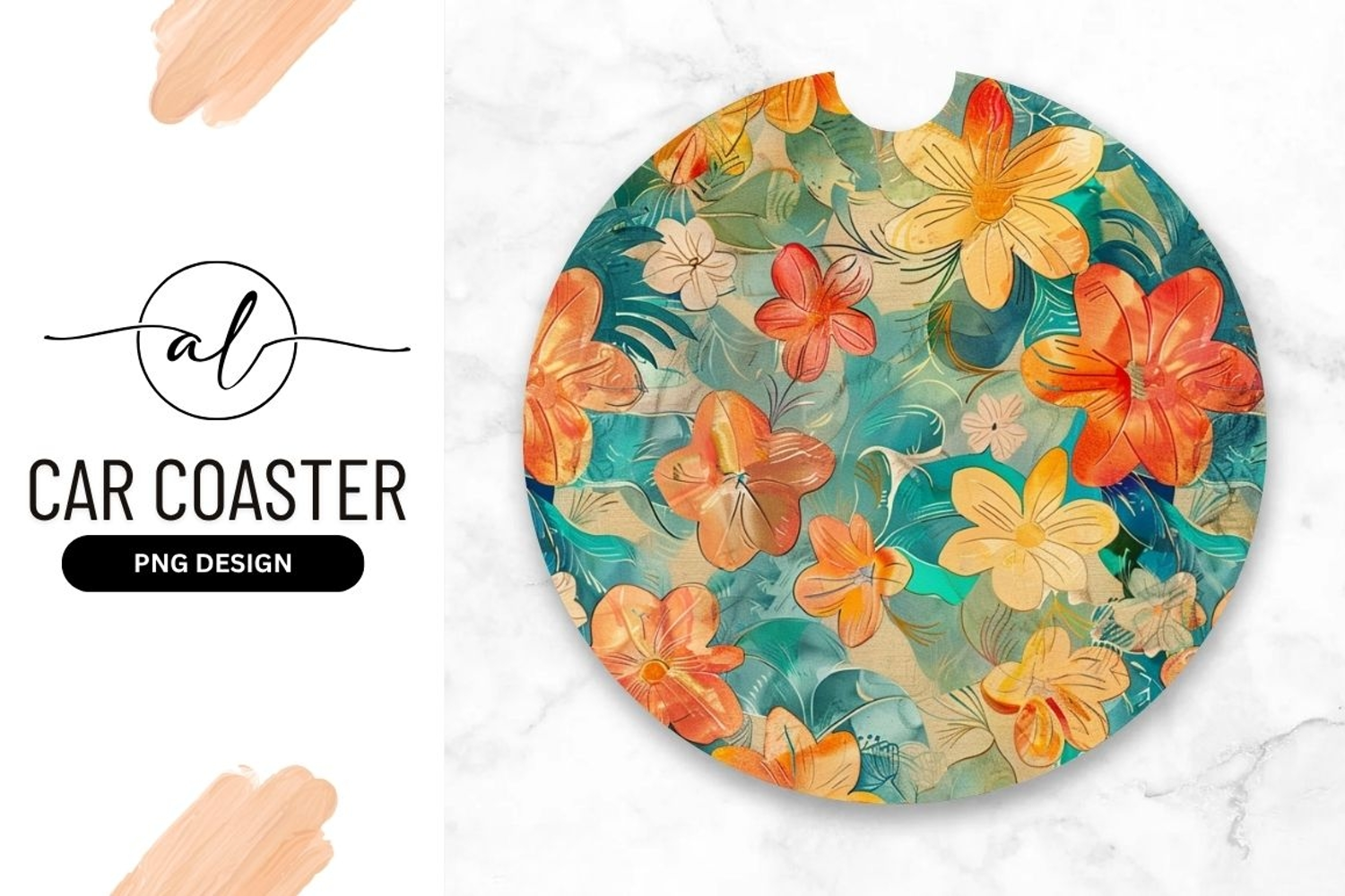 Floral Pattern Round Car Coaster Png with Orange Yellow and Teal Flowers
