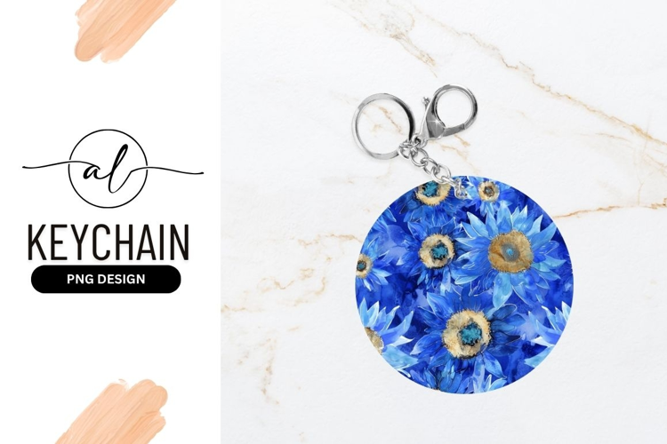 Blue Sunflower Watercolor Pattern Round Keychain Png example image 1