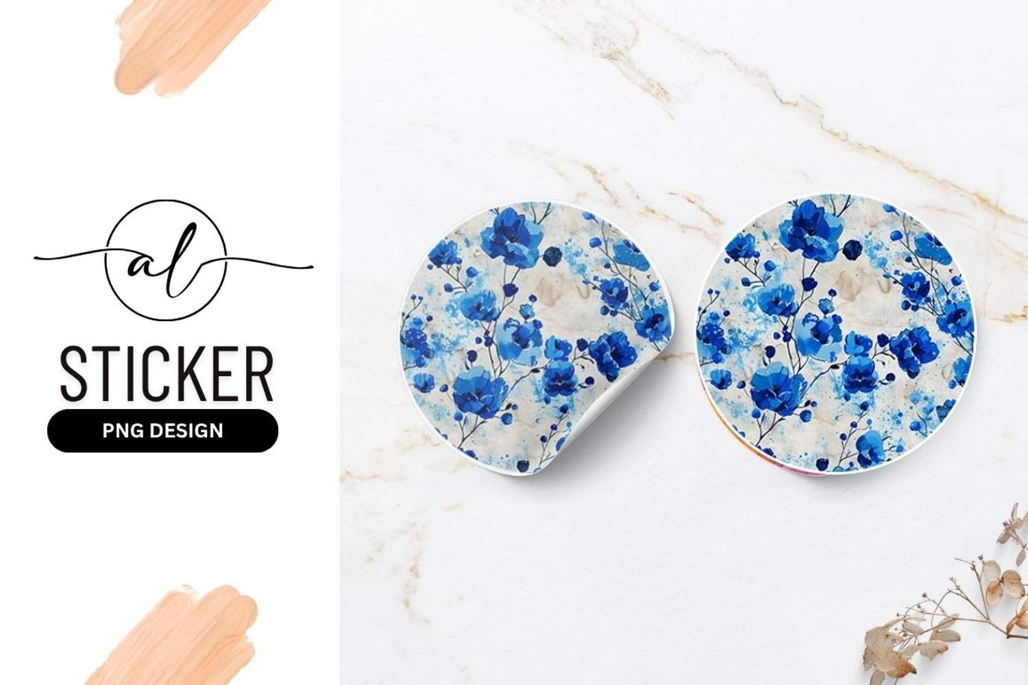 Round Sticker Png with Watercolor Blue Floral Pattern example image 1