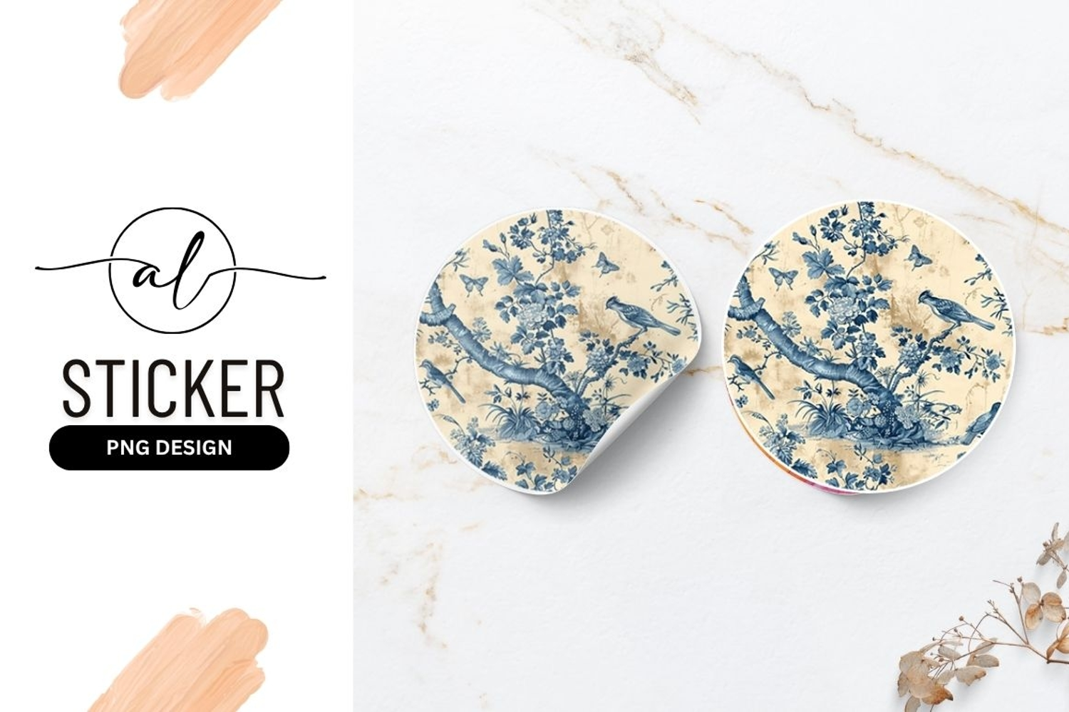 Round Sticker Png Blue and Beige Chinoiserie Birds example image 1