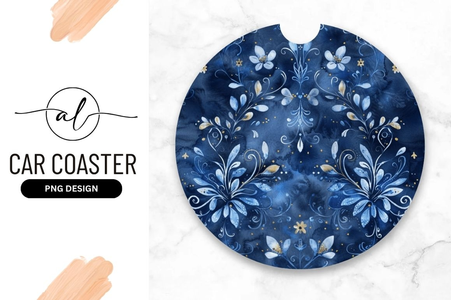 Watercolor Floral Design on a Round Car Coaster Png with Blue and Gold Accents