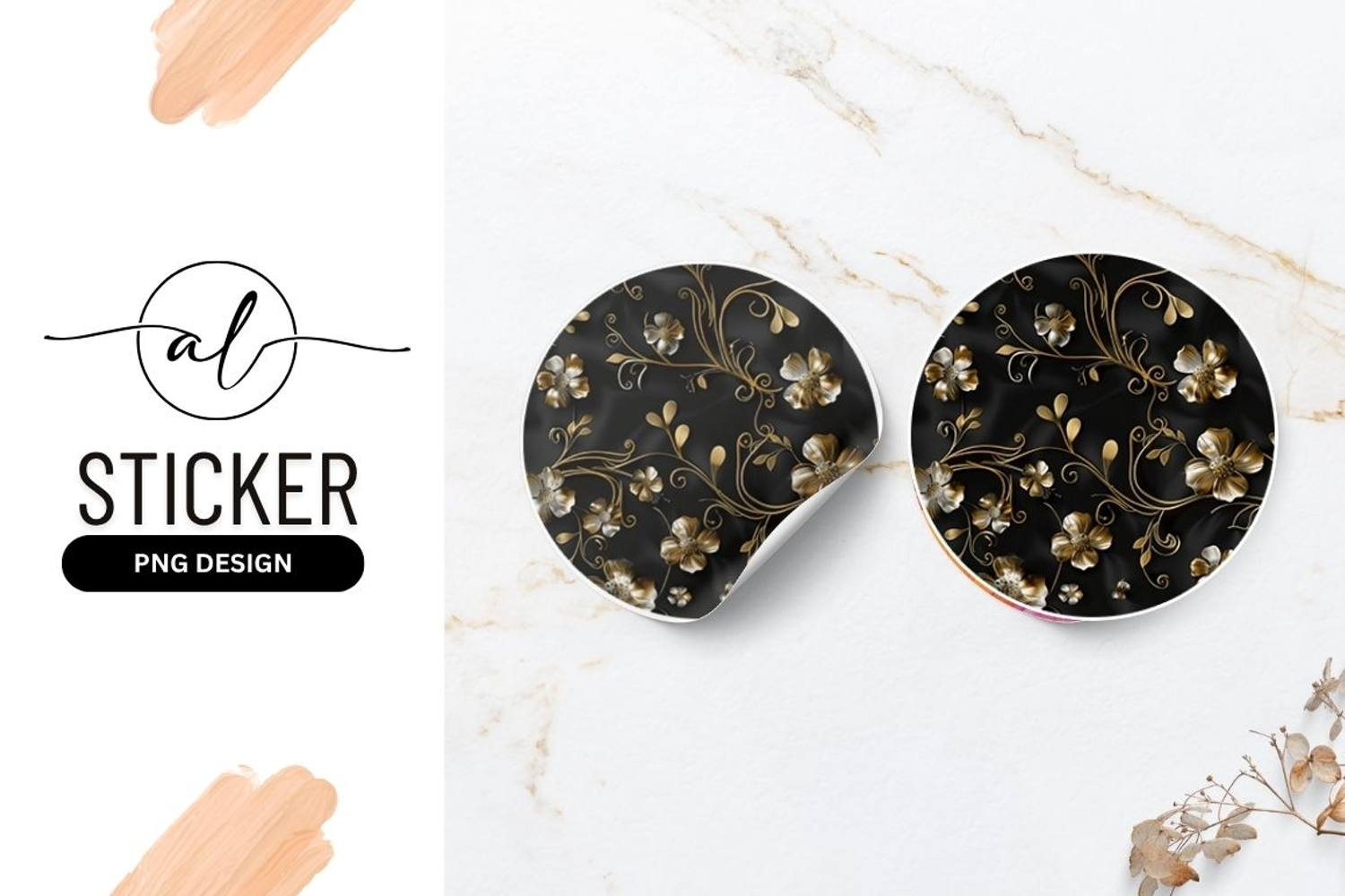 Golden Floral Ornaments On Black Background Round Sticker Png