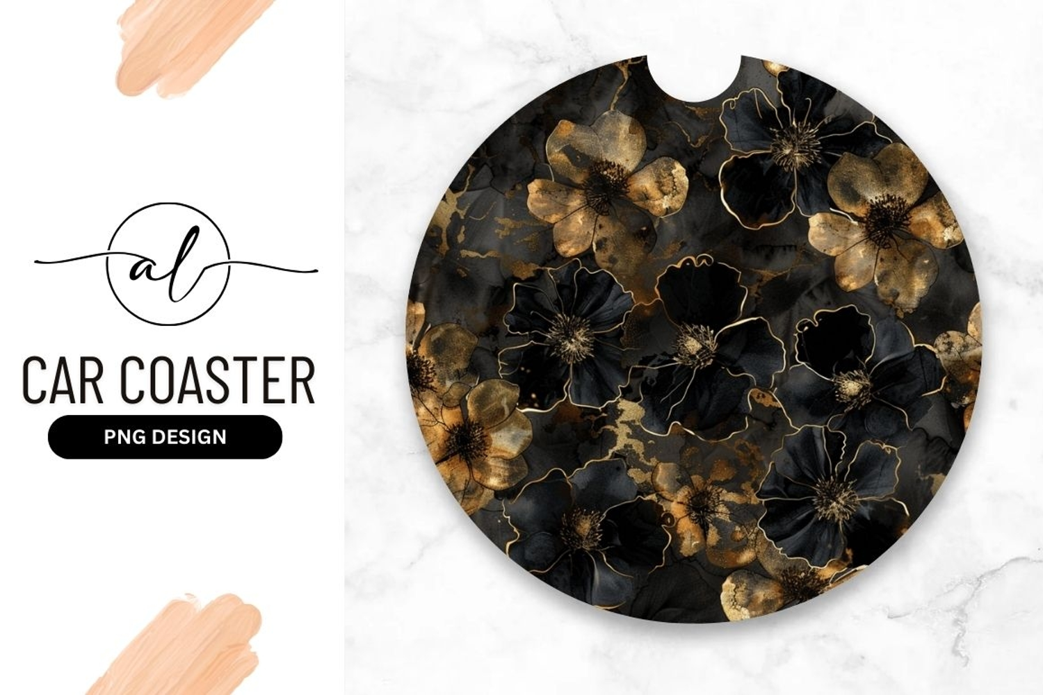 Elegant Black And Gold Flowers Round Car Coaster Png Design example image 1