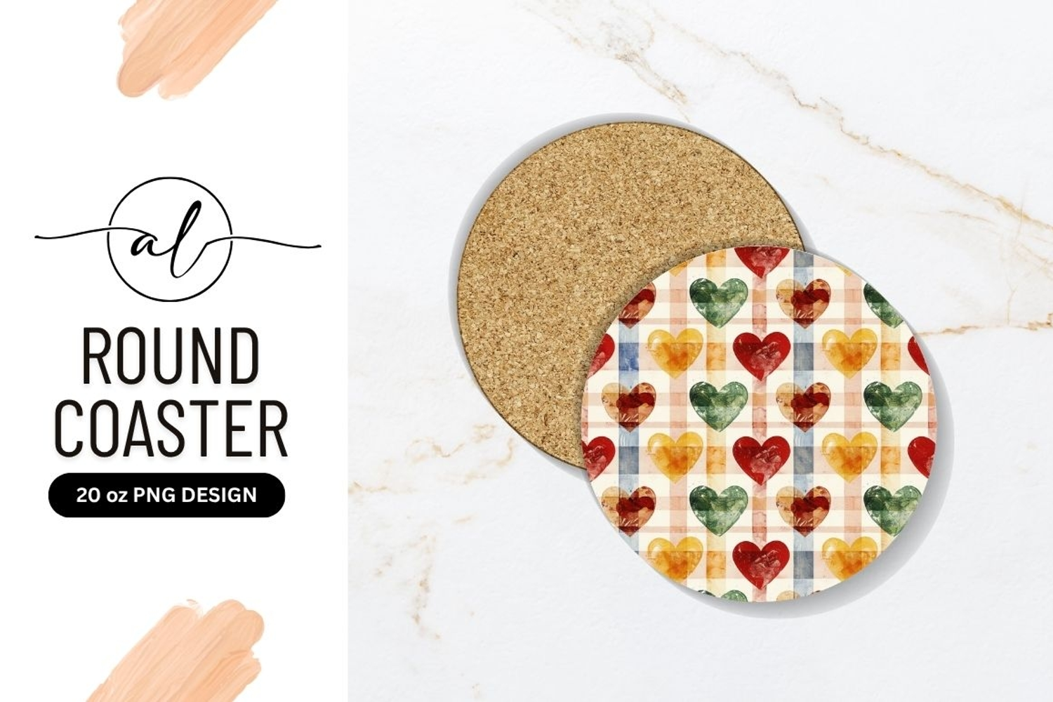 Watercolor Hearts On Plaid Round Coaster Png example image 1