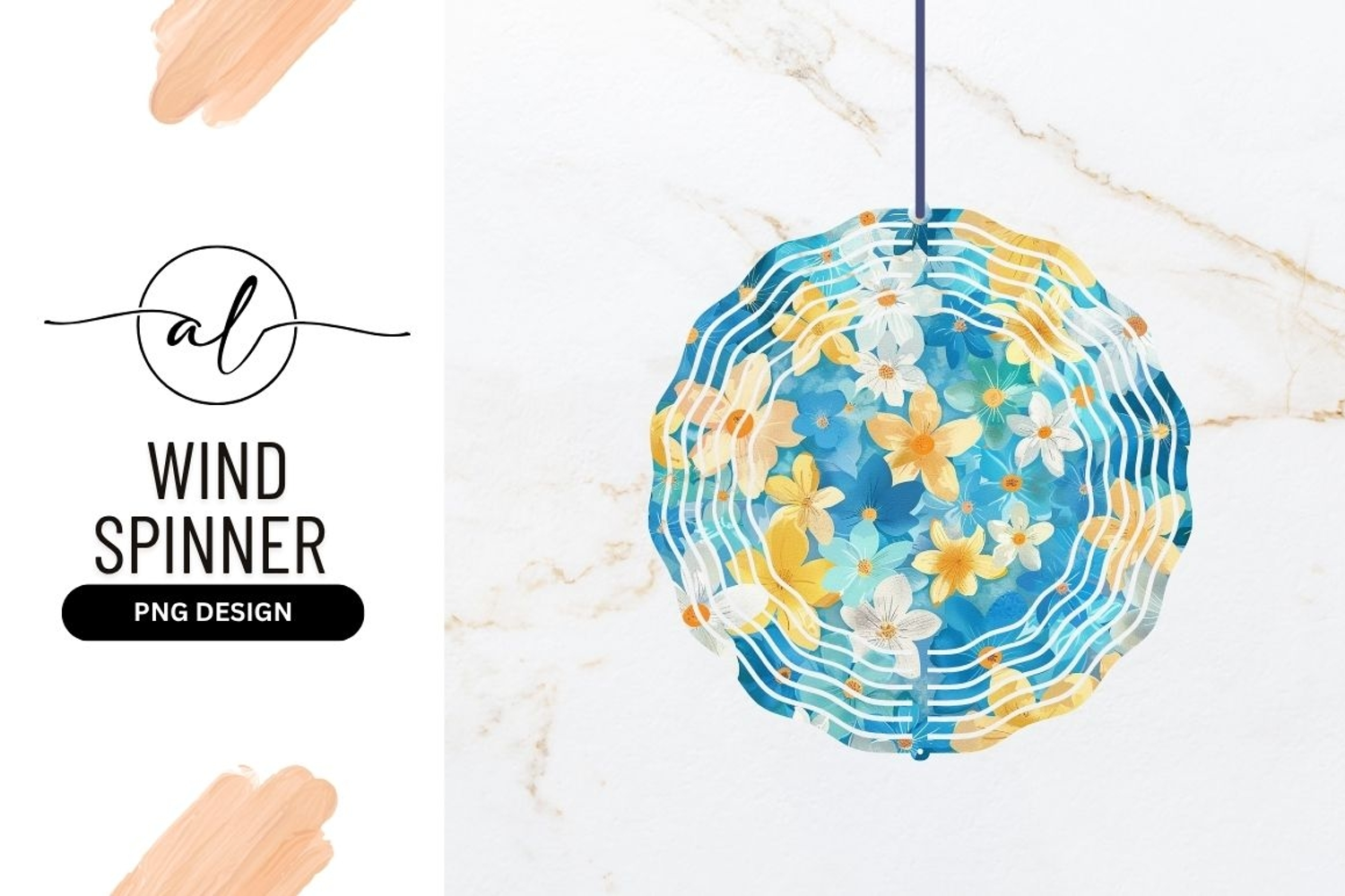 Watercolor Floral Pattern in Blue Yellow and White Wind Spinner Round P N G