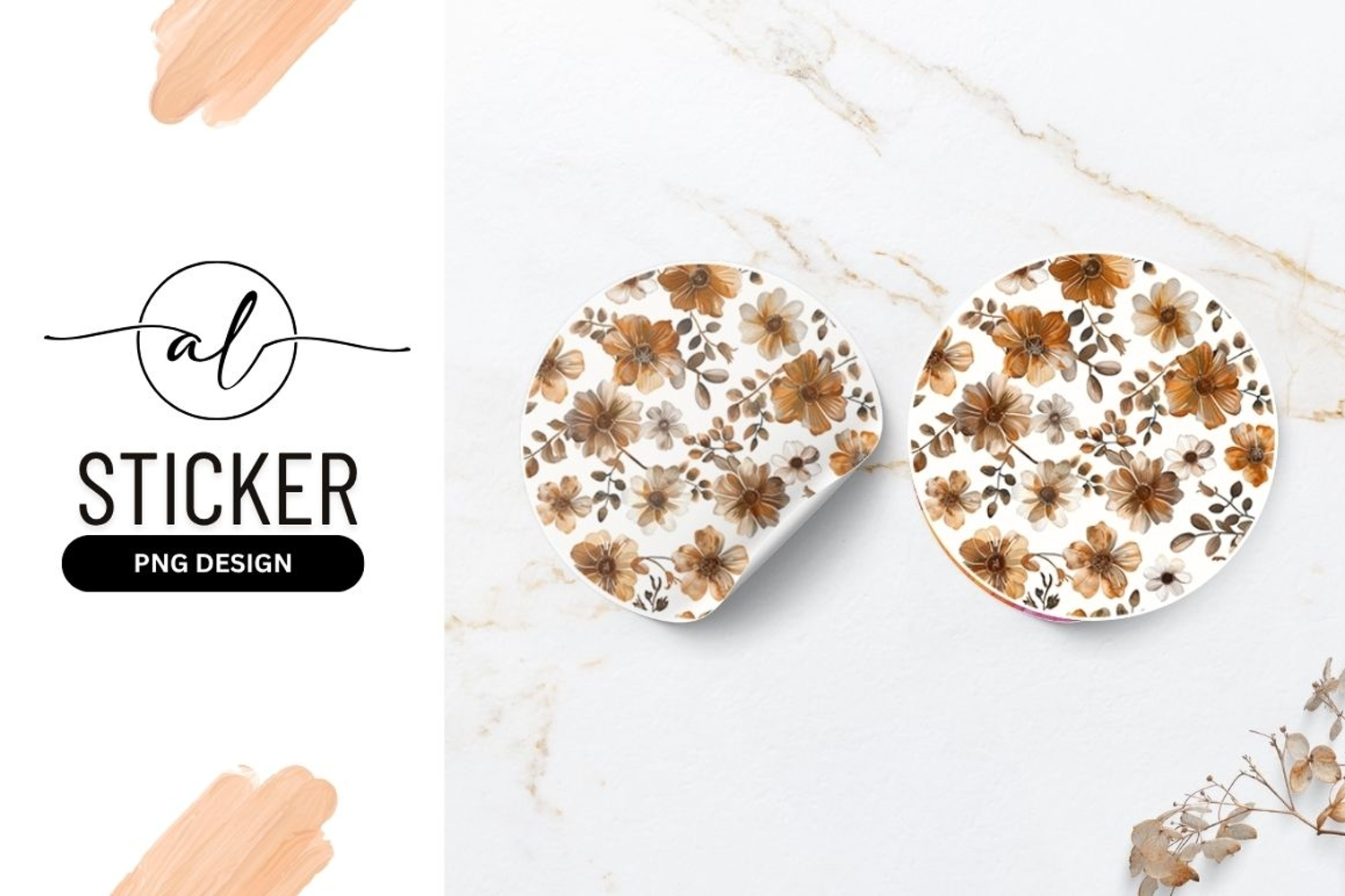 Round Sticker P N G Floral Watercolor Design in Brown example image 1