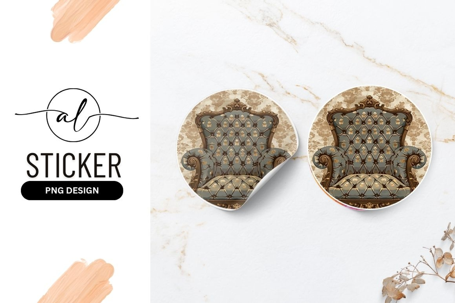 Ornate Teal and Gold Armchair Illustration on a Round Sticker P N G
