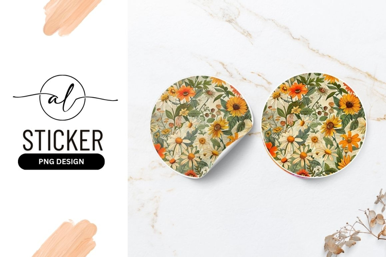 Round Sticker P N G with Vintage Floral Arrangement of Daisies and Sunflowers