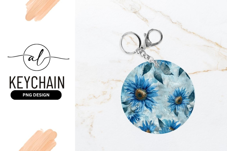 Watercolor Blue Sunflower Floral Design Round Keychain P N G example image 1