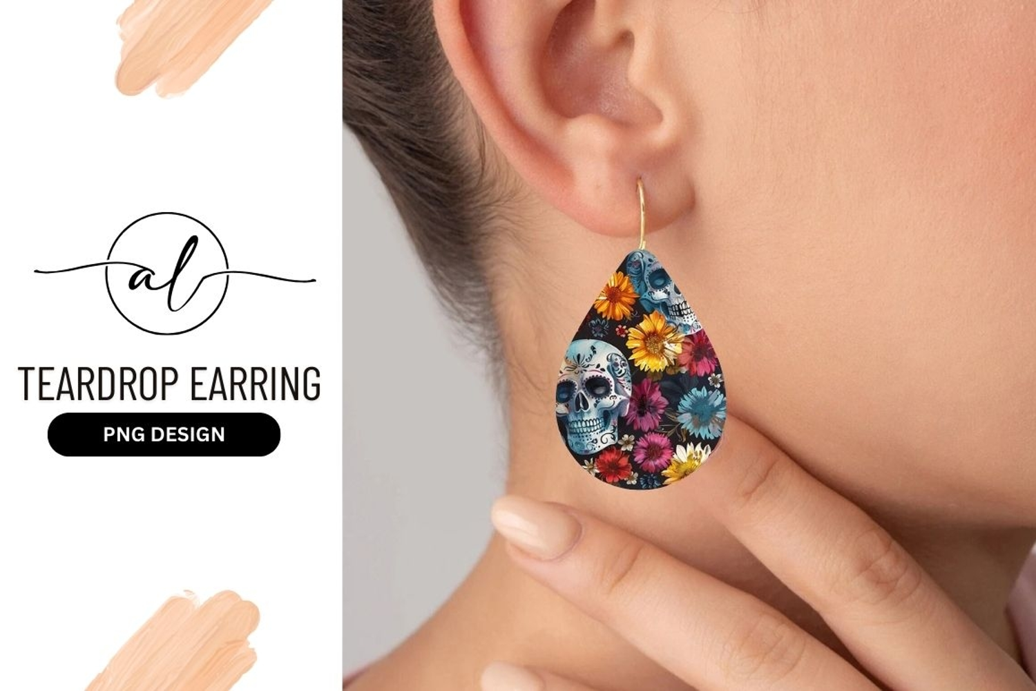 Vibrant Sugar Skull and Flower Teardrop Earring Design example image 1