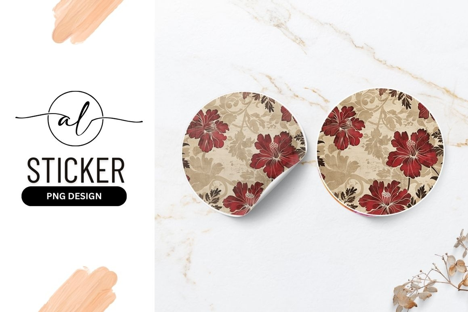 Brown Beige Floral Pattern Red Flowers Home Decor Round Sticker Png Design Decorative Sticker Nature-inspired Elegant Floral Round Sticker Png Design