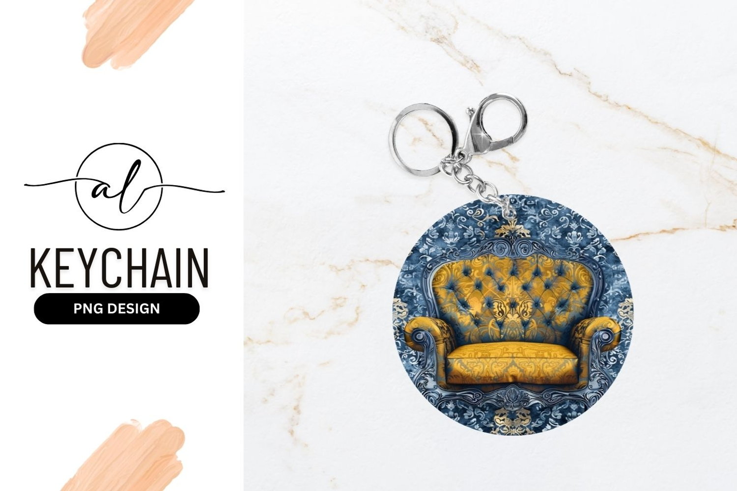 Gold Blue Luxurious Sofa Sophistication Intricate Patterns Ornate Design Keychain Design Round Keychain Ornate Round Keychain Design