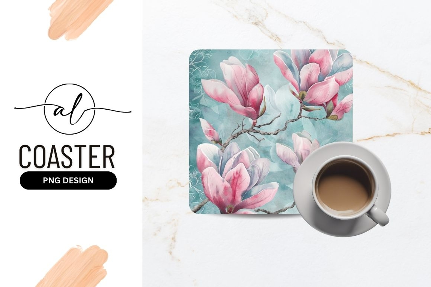 Pink Flowers Coaster Flower Design Home Decor Light Blue Background Magnolia Flowers Table Decor Png Design Square Coaster Pink Magnolia Flower Square Coaster Png Design