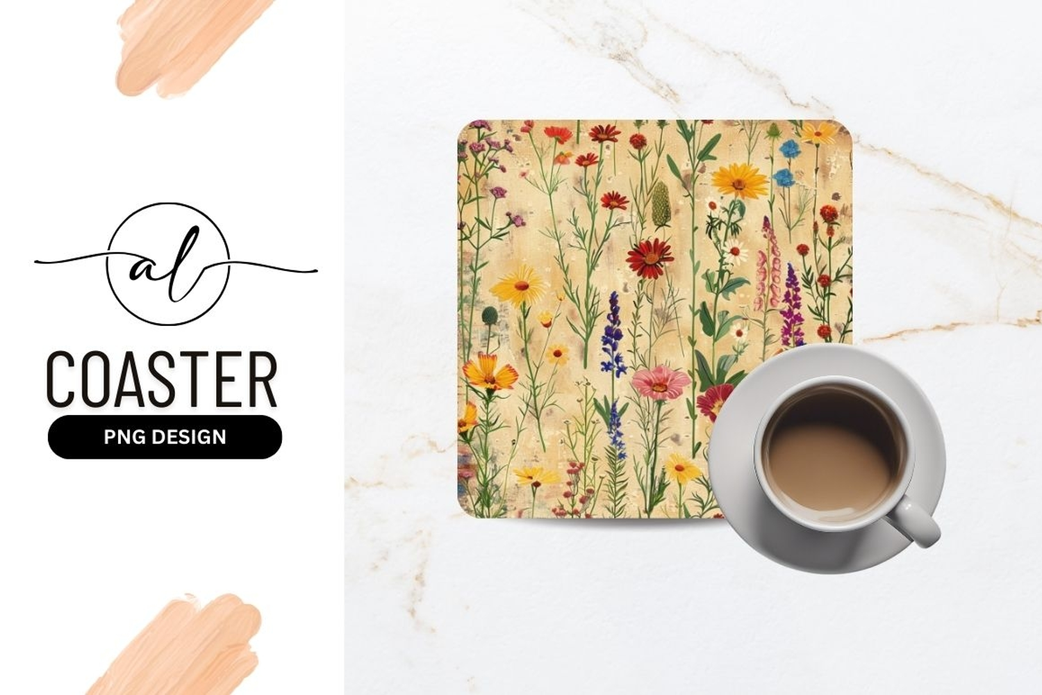 Vintage Rustic Floral Wildflowers Coaster Beige Background Table Setting Png Design Square Coaster Vintage Floral Square Coaster Png Design
