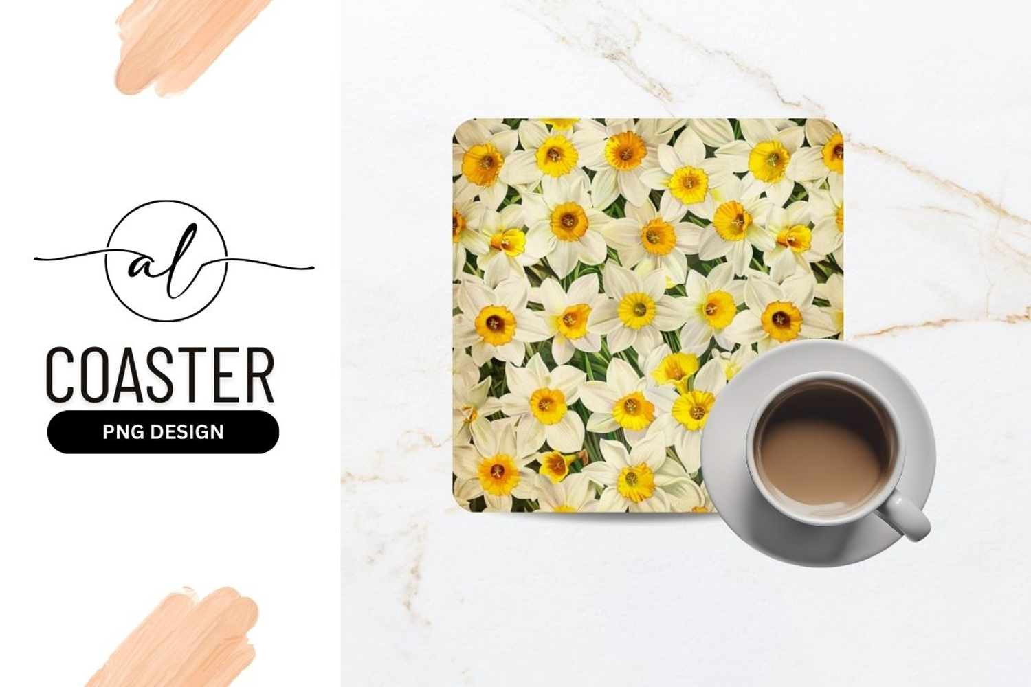 Green Leaves Daffodil Coaster Yellow Flowers Home Decor White Flowers Table Decor Png Design Square Coaster White And Yellow Daffodil Square Coaster Png Desig
