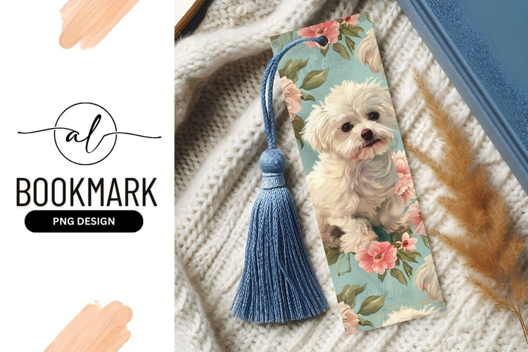 Maltese Dog with Pink Flowers on a Light Blue Background Bookmark P N G