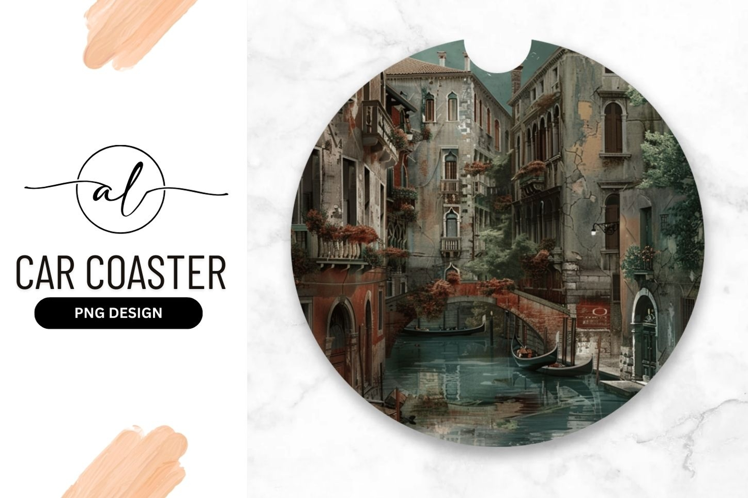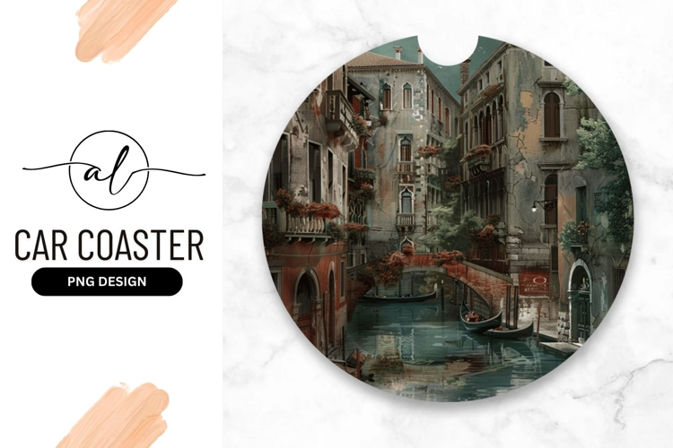 Venetian canal scene round car coaster png design example image 1