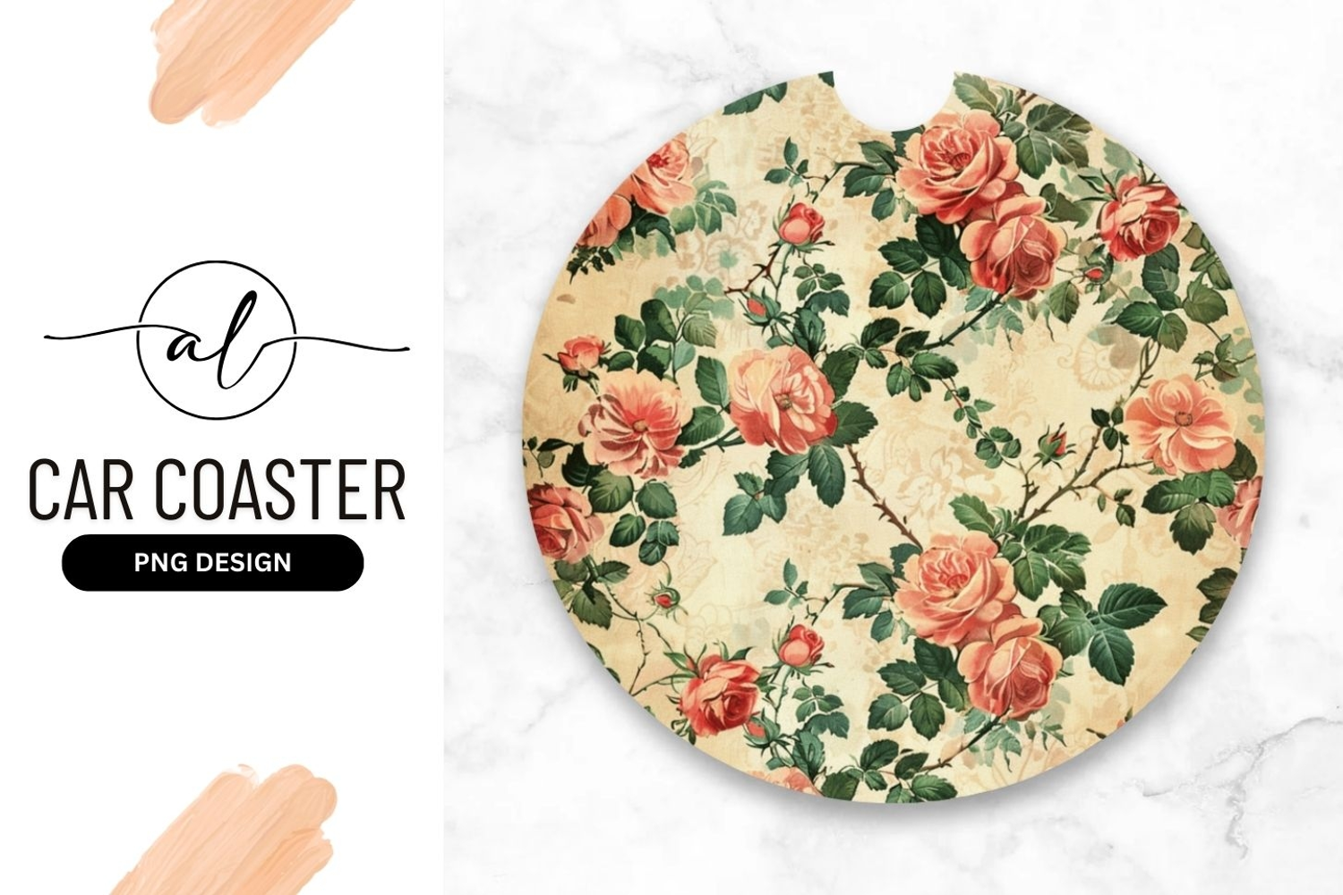 Green Leaves Interior Decoration Pink Roses Png Design Vintage Floral Design Car Accessory Floral Motifs Round Car Coaster Light Beige Background Vintage Floral Round Car Coaster Png Design