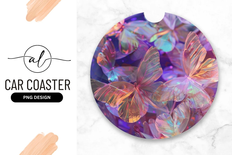 Round car coaster with iridescent butterfly design example image 1