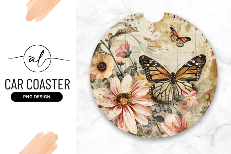 Butterfly Floral Design Pastel Colors Vintage Aesthetic Round Car Coaster Decorative Coaster Intricate Details Vehicle Accessory Round Car Coaster With Floral And Butterfly Design