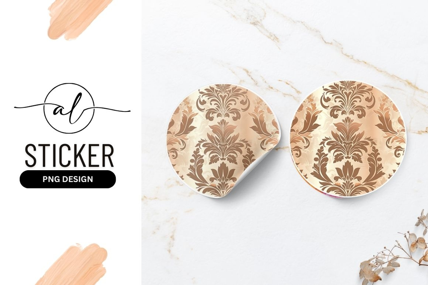 Sticker Brown Beige Floral Pattern Damask Pattern Round Sticker Ornate Design Decorative Sticker Craft Sticker Elegant Damask Pattern Round Sticker Png