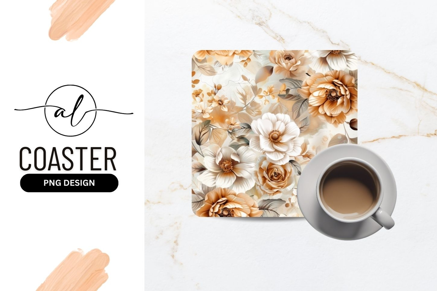 Flowers Beige White Floral Pattern Green Leaves Coaster Light Brown Png Design Square Coaster Elegant Floral Square Coaster Png Design