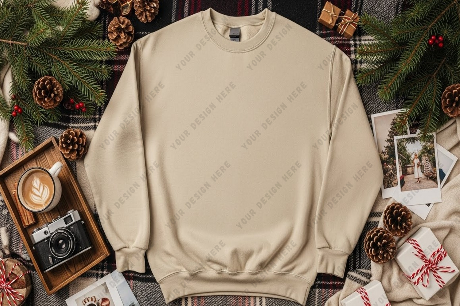 A stylish and comfortable beige crew neck sweatshirt perfect for casual wear. Ideal for staying warm and cozy during the holiday season or any chilly day. This sweatshirt is displayed in a festive setting with Christmas decorations and a cozy atmosphere.