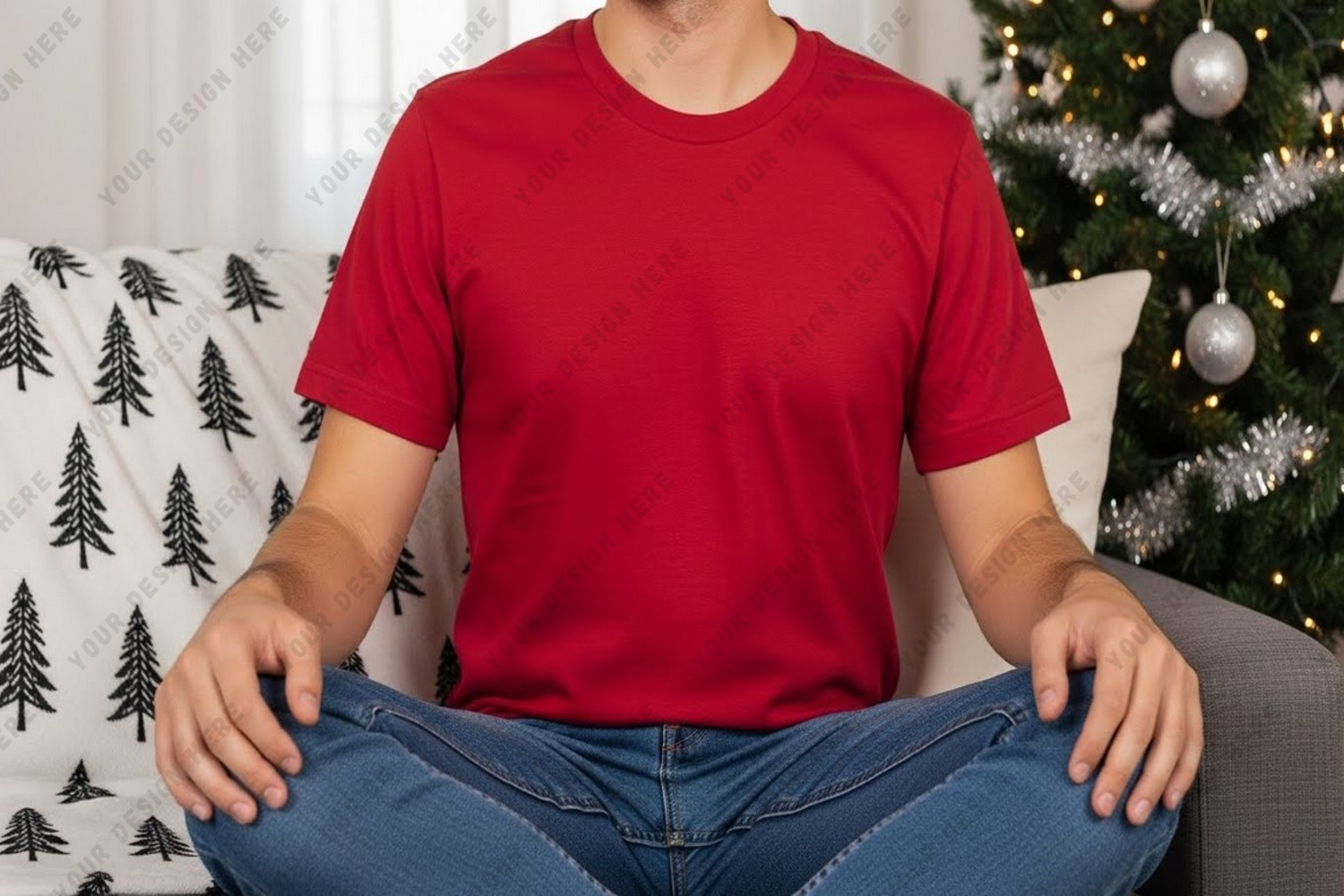 Holiday T-shirt Christmas Mockup Model Christmas Tree Pillows Festive Couch Red T-shirt