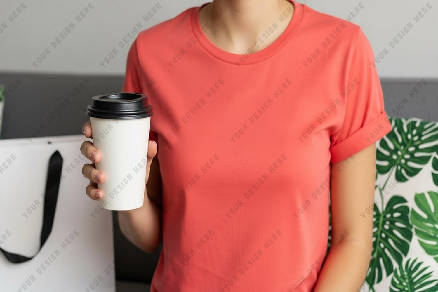 Fashion T-shirt Minimalist Mockup Model Background Red Coffee Cup Green Foliage Casual Wear