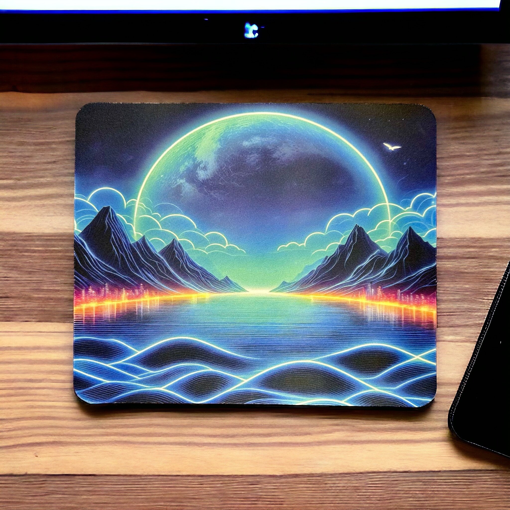 Seascape with neon light effect in retro style 80's. Mousepad sublimation design. Neon glowing, synthwave, hi tech and music.