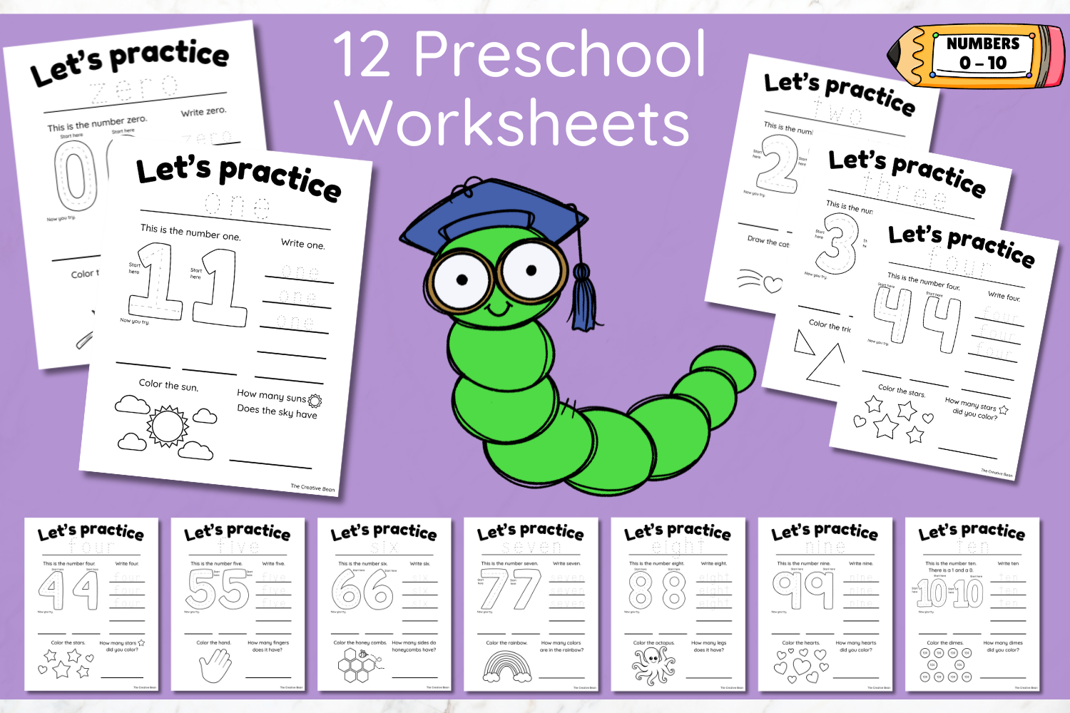 Looking for some fun educational printables for your young one? These printables include zero through 10 with an alternative "4" option.They are perfect for Pre-K/ Kindergarten age children trying to learn numbers from 1-10. Each page offers number tracing, number spelling, coloring and counting - giving children the chance to have fun and be creative while learning.