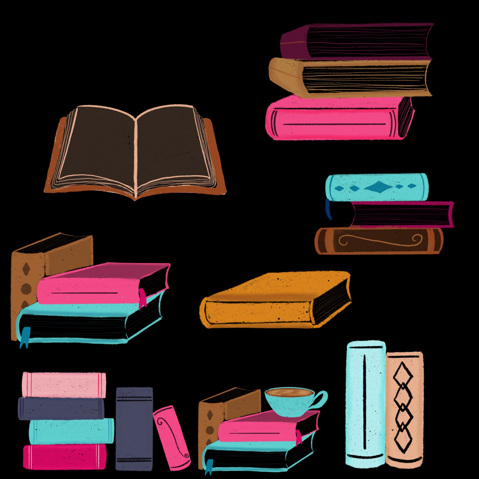 ✓ Hand-drawn library elements clipart. Includes book stacks, a bookshelf, a library cart, 2 potted plants, a lamp, and much more.