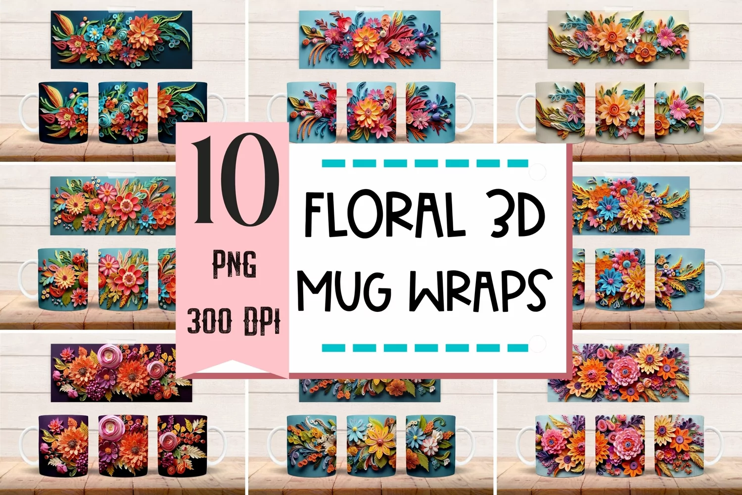 Bundle of 10 3D floral effect designs for 11oz mug sublimation. Each graphic measures 8,5" X 3,5".