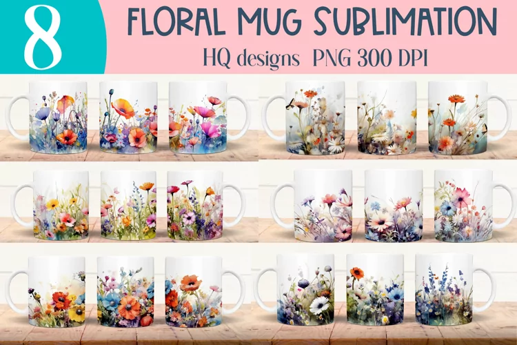 Bundle of 8 watercolor wildflower designs for 11oz mug sublimation. Each graphic measures 8,5" X 3,5".