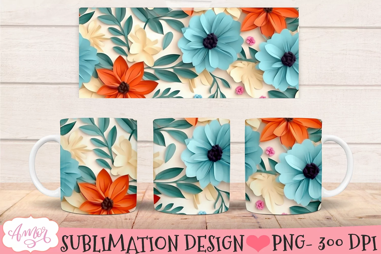 3D floral design for 11oz mug sublimation. Each graphic measures 8,5" X 3,5".