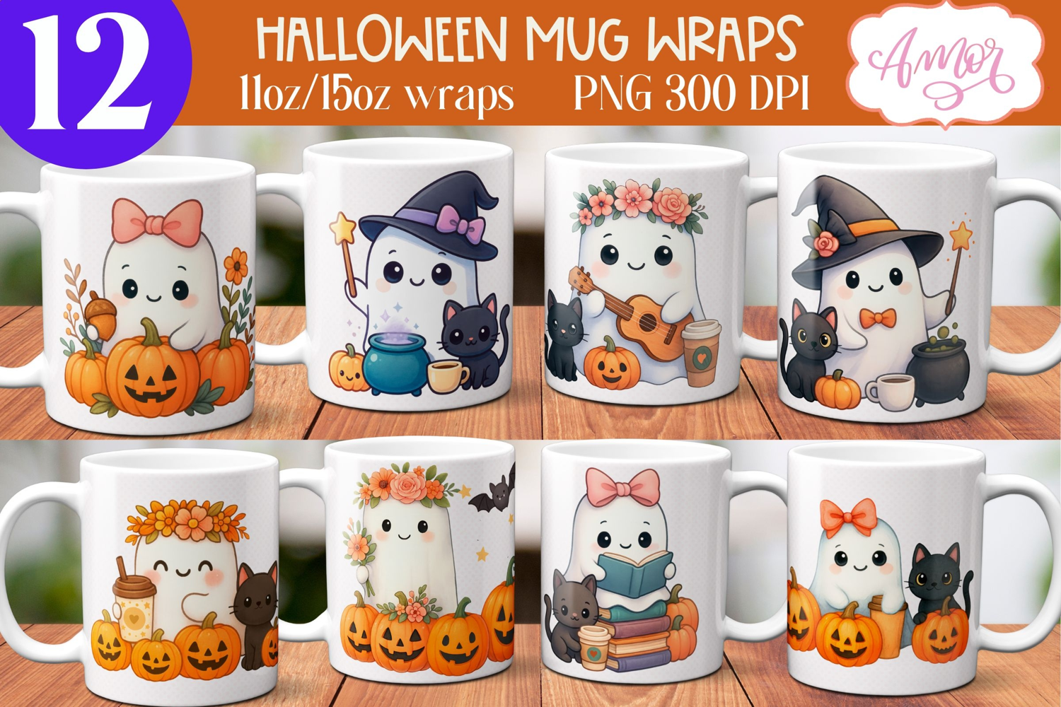 Bundle of 12 cute Halloween designs for mug sublimation. Each graphic measures 8,5" X 3,5" for the 11oz mugs, and 9" X 3,5" for the 15oz mugs.